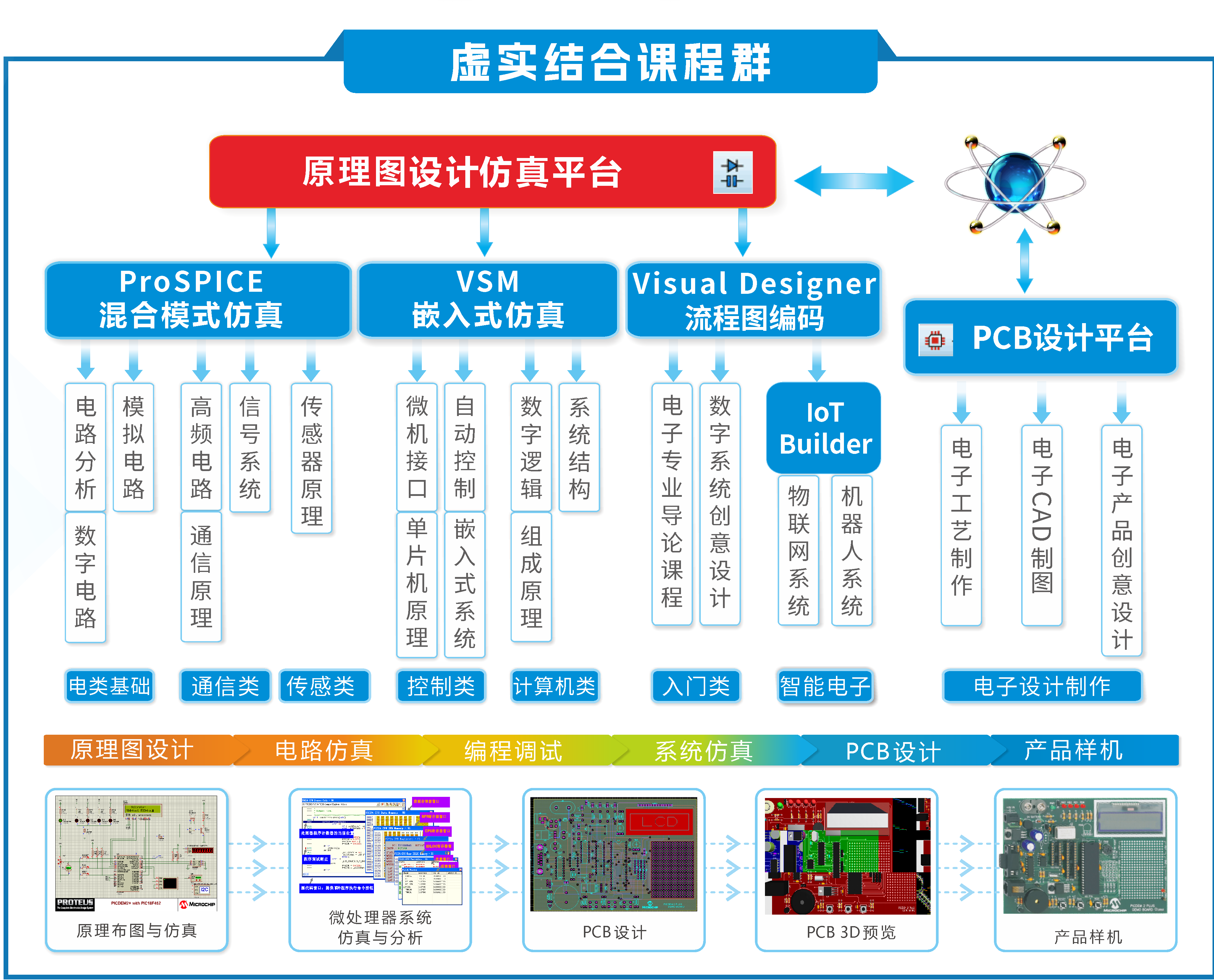 电子信息大类虚拟仿真实验中心建设方案采用Proteus仿真软件,结合相应的硬件平台,以及配套的教学实验资源,构成一个从虚拟到实际、从软件到硬件、从概念到产品的全过程设计的多功能实验平台。它主要用于电路基础,模拟电路、数字电路、传感器应用、计算机组成原理、微机原理与接口技术、嵌入式系统(单片机应用系统、ARM应用系统、Arduino可视化计、树莓派可视化设计)、物联网系统( loTBuilder)等课程的实训、研究等。